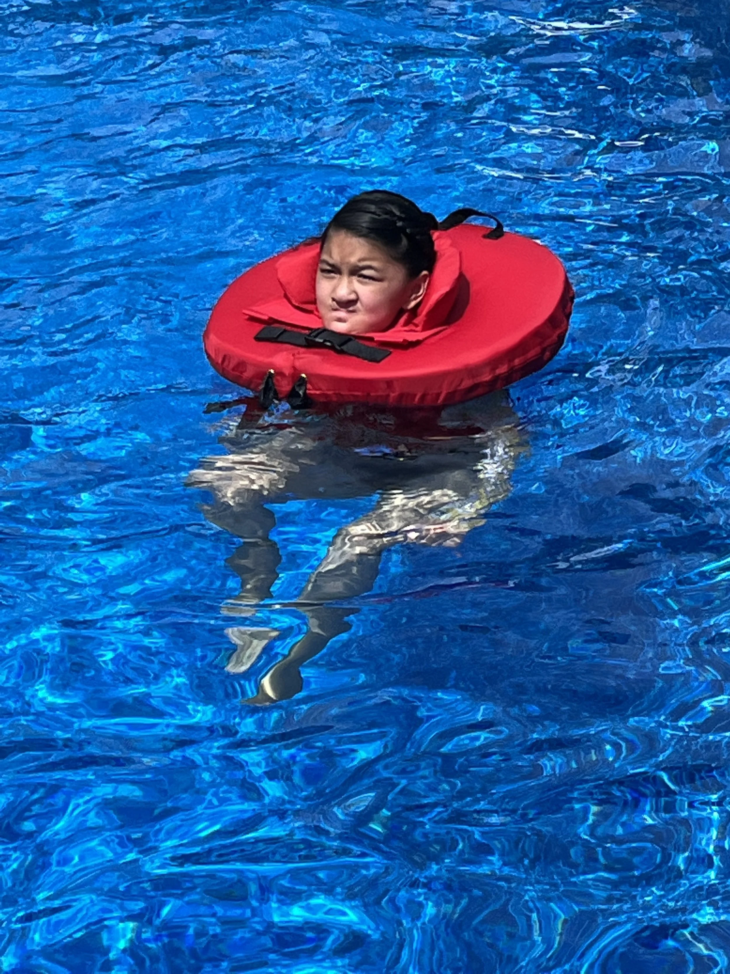 Claire’s diagnosis of Autism and an intellectual disability affect her ability to comprehend water safety. While she is in the water, she likes to dip her head into the water and drink it. In the past, this has caused her to choke which created a safety concern.